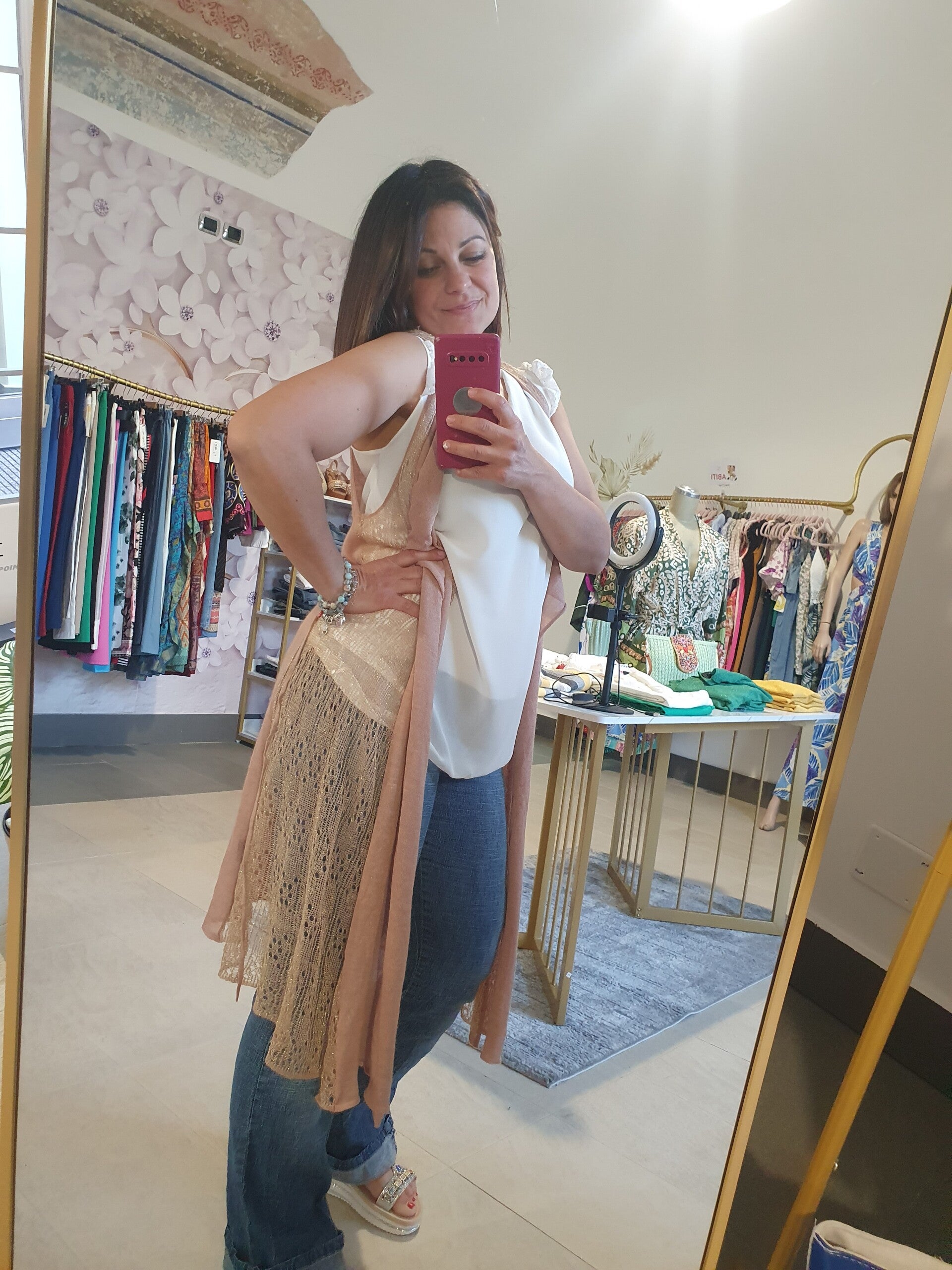 Cardigan Smanicato effetto glitter con lavorazione laterale