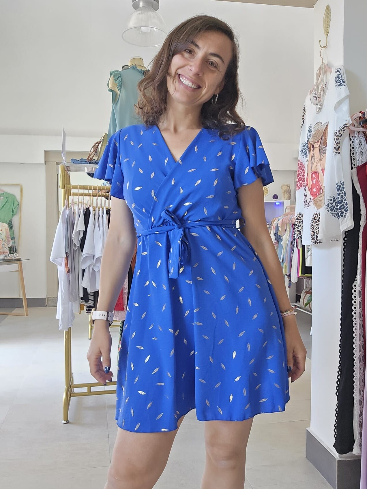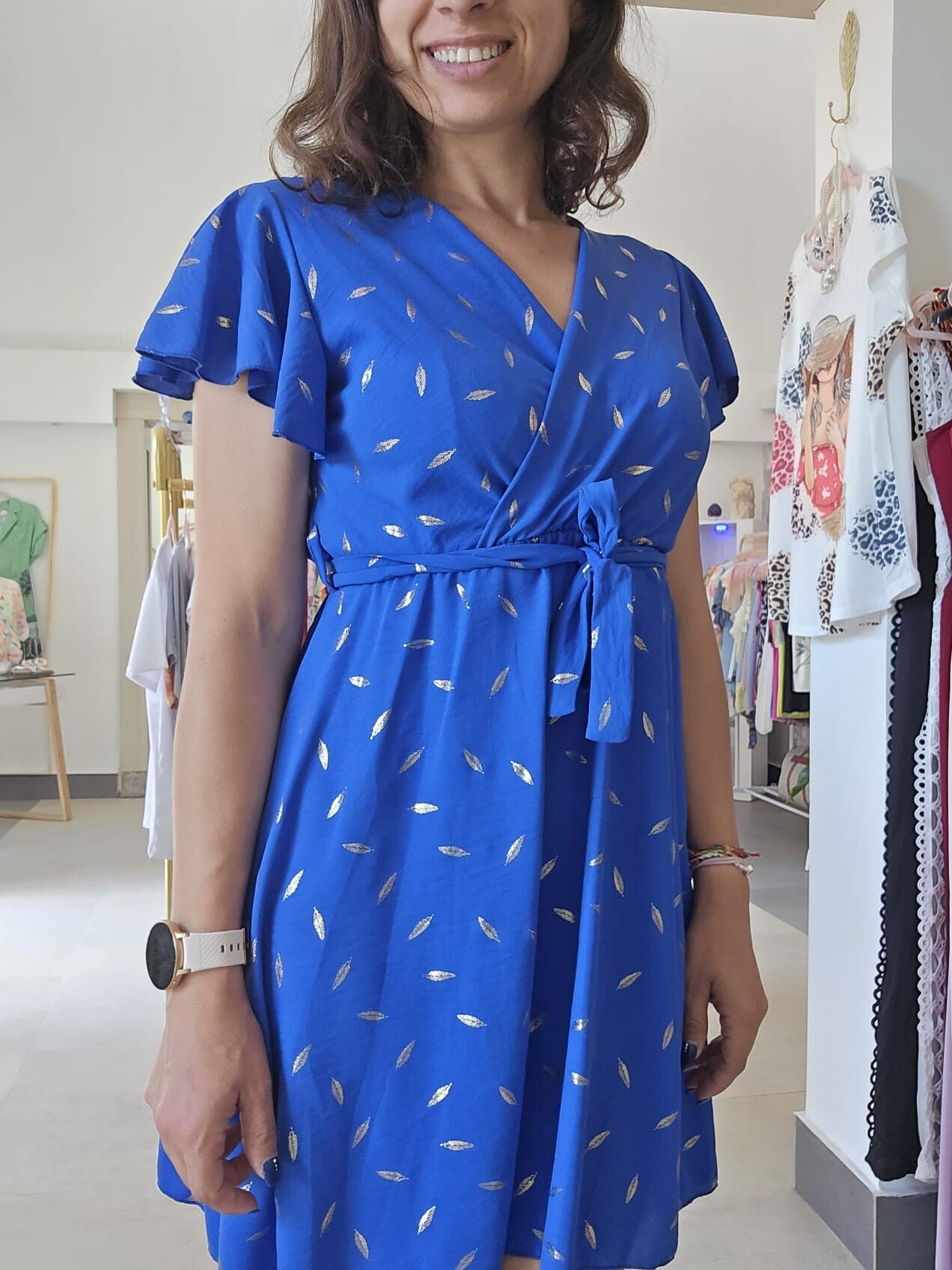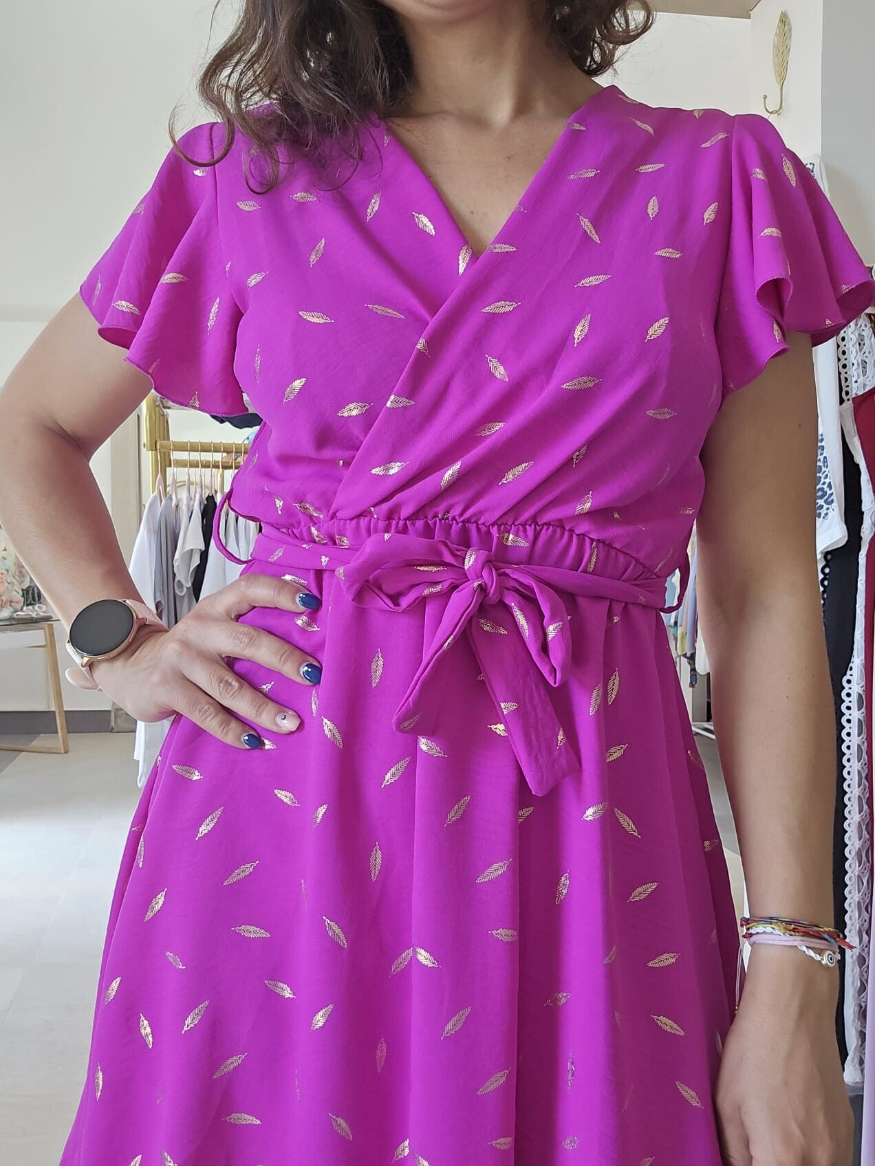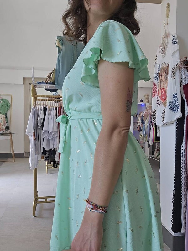 Vestitino con effetto piumato, chiusura kimono sul seno e laccetto in vita