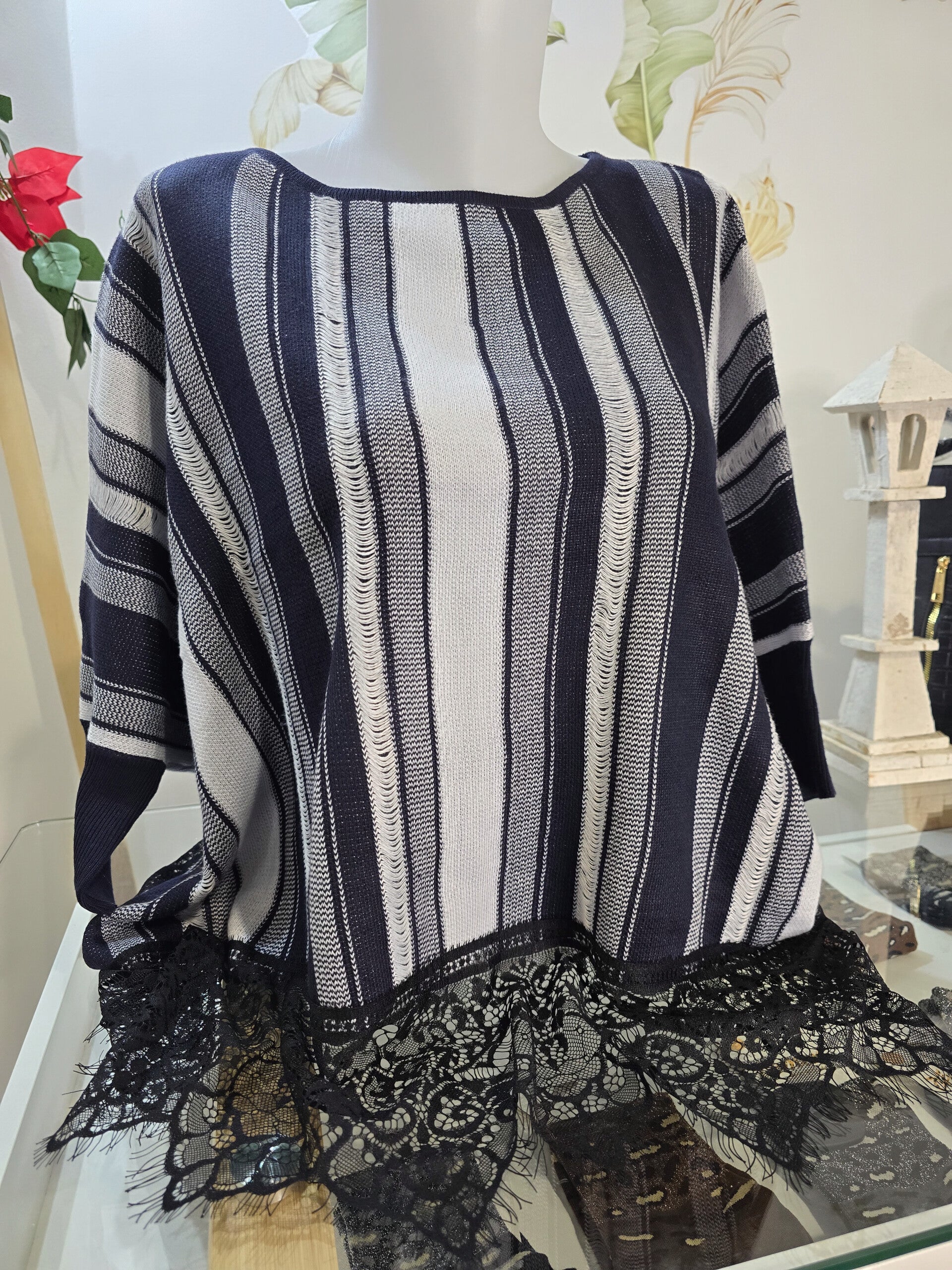 Maglioncino righe blu e bianco con merletto nero taglia unica