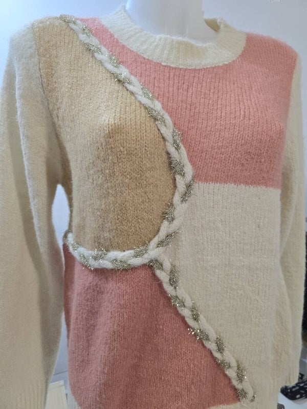 Maglione panna, beige e rosa con doppia treccia beige e dorata taglia unica