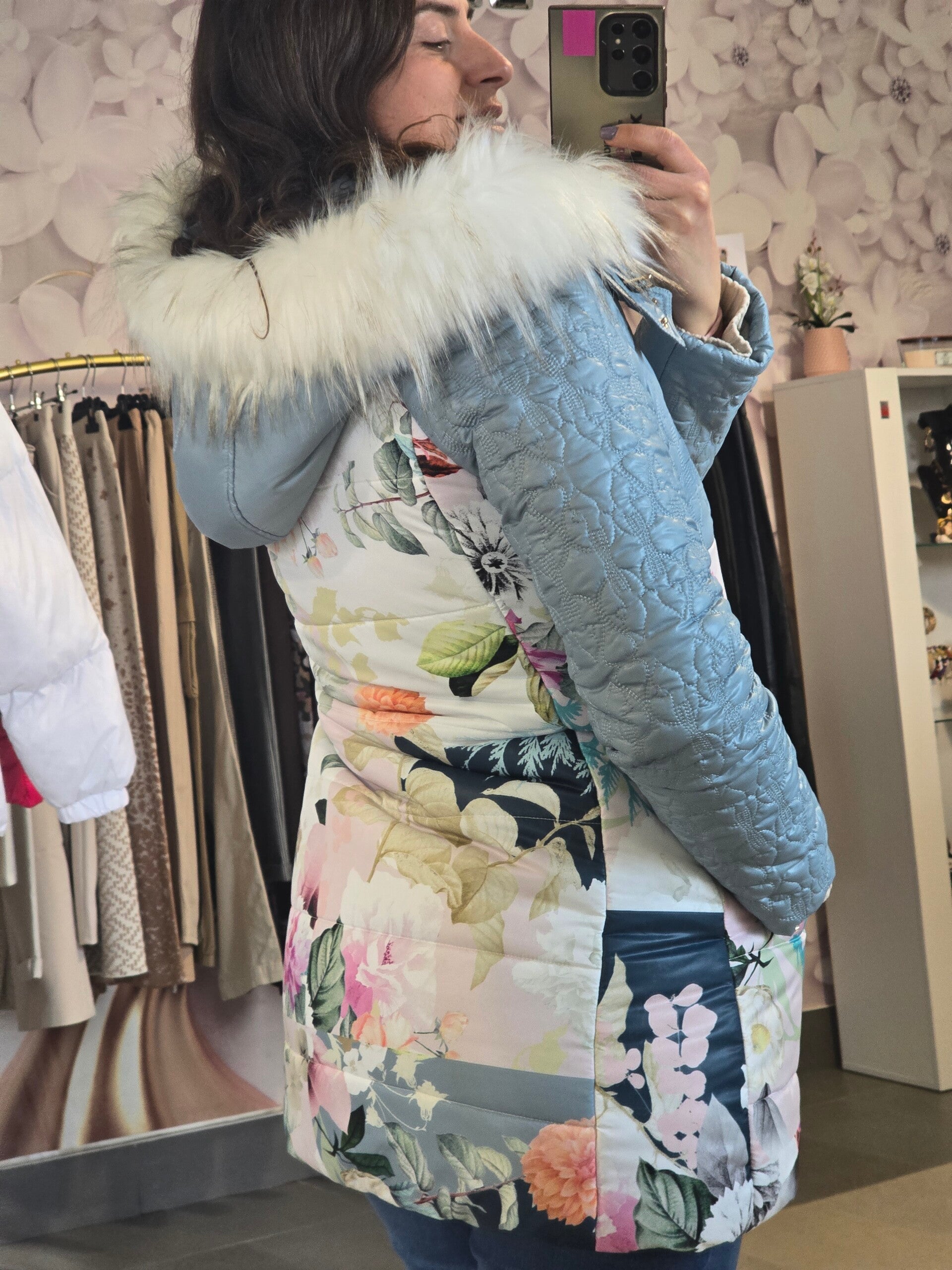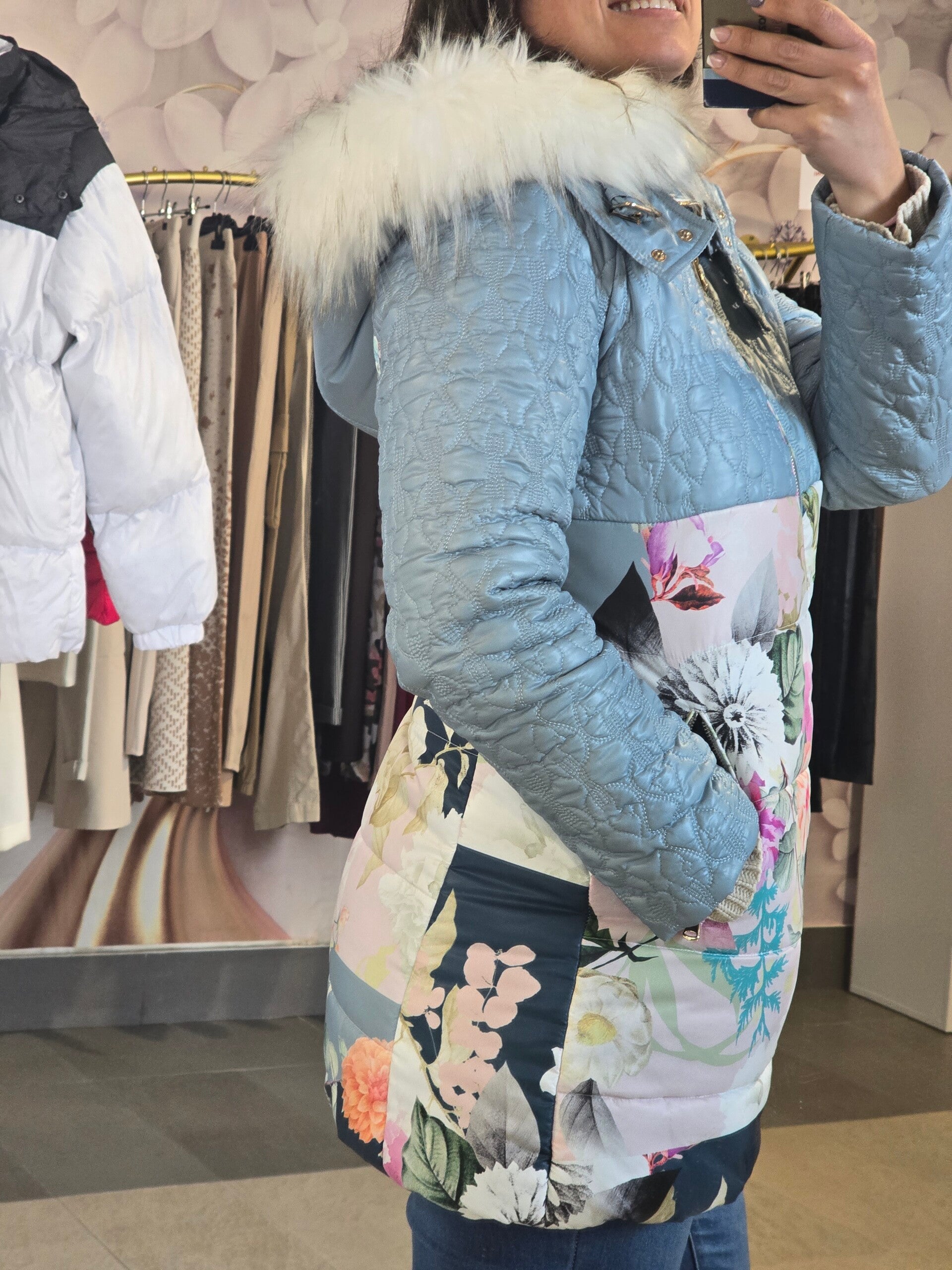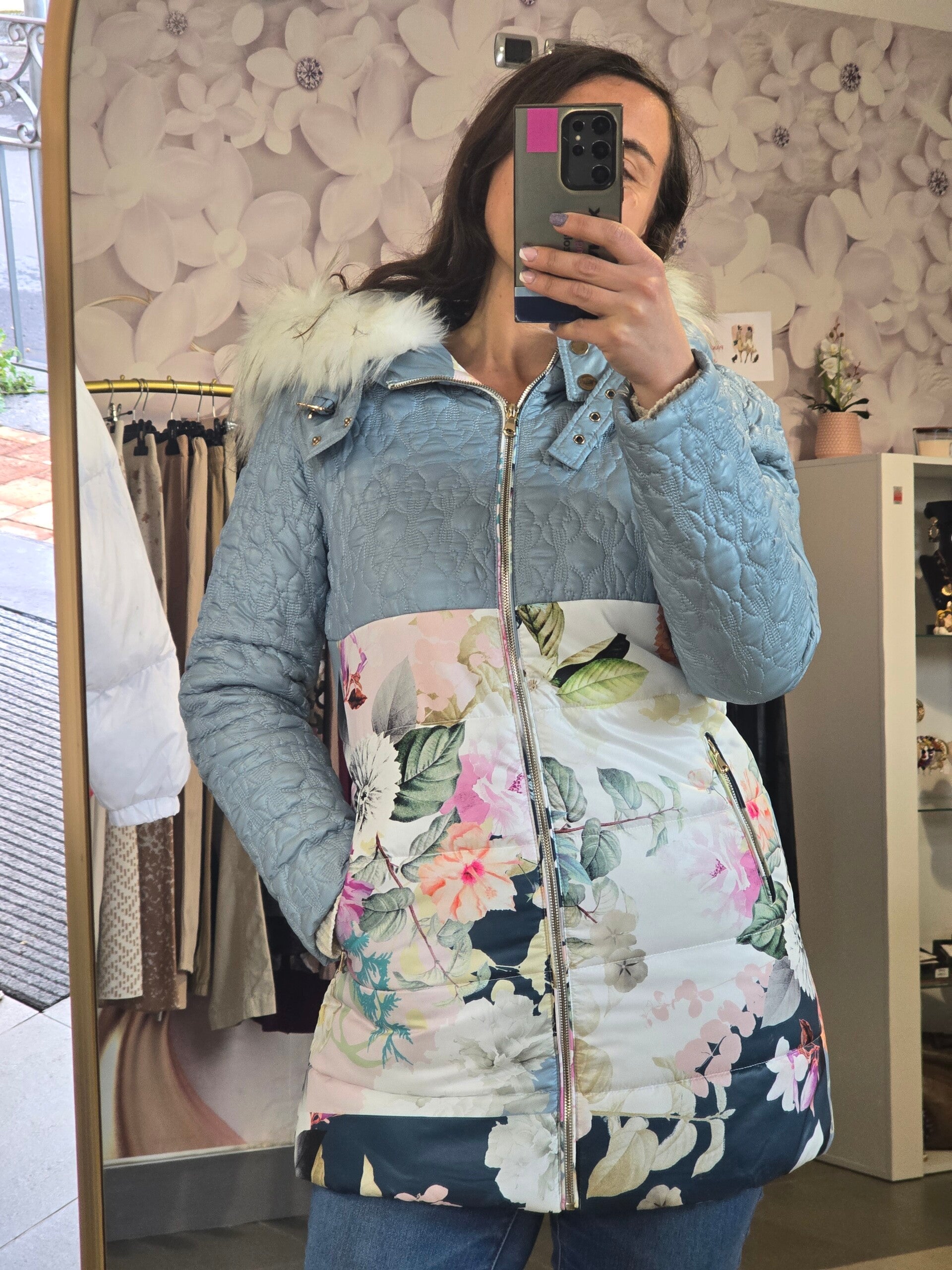 Piumino azzurro con stampe floreali e cappuccio con pellicciotto taglia S